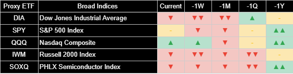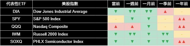 在投資者等待關鍵財報之際,美國主要指數普遍走低,標普500指數單日下跌(-0.58%),其趨勢評估亦從先前的正向立場轉為中性。此轉變表明近期的向上動能可能停滯。道瓊工業平均指數亦微幅下跌(-0.57%),維持其負面趨勢,儘管相較於一週前,短期下行壓力似乎有所趨緩。相較之下,那斯達克綜合指數(-0.44%)則守住其正向趨勢,在謹慎的市場情緒中展現相對韌性。羅素2000指數則錄得更為顯著的單日跌幅(-1.05%),雖然其趨勢依然為負,但相較於上週觀察到的較強負面態勢則有所緩和。費城半導體指數(-0.47%)亦持續其負面趨勢。