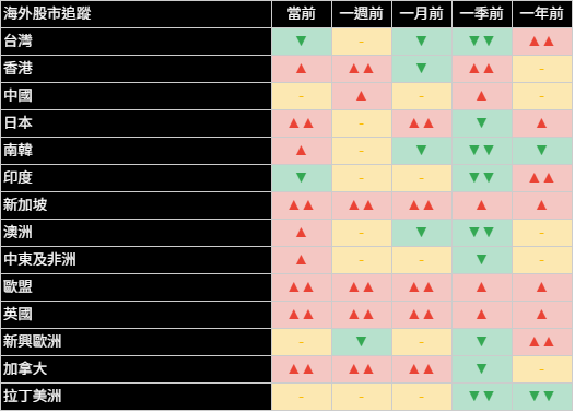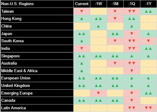 相反地,中國市場的展望在一週前從正向轉為中性,顯示動能減弱,其市場當日亦下跌(-1.31%)。台灣的趨勢近期從中性轉為負面。印度維持其負面趨勢,其市場當日亦微幅下跌(-0.44%)。拉丁美洲的趨勢則從正向轉弱至中性,顯示近期向上動能有所流失。此種分歧突顯區域經濟狀況、政策預期和特定市場驅動因素正創造出不同的發展軌跡。日本和部分歐洲地區的強勢,與中國市場情緒的降溫形成對比,這讓全球資產配置者對機會與風險何在產生了疑問。