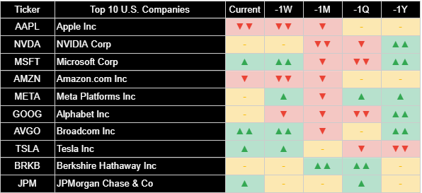 Performance among the top 10 U.S. companies was mixed, with Broadcom Inc. (+1.60%) standing out with a gain and maintaining its very strong positive trend, signaling continued investor confidence. Conversely, Tesla Inc. saw a notable daily decline (-1.65%), though its overall trend remains positive. NVIDIA Corp. (-0.51%) experienced a slight dip ahead of its highly anticipated earnings report, with its trend holding at neutral. Microsoft Corp. (-0.72%) also declined, and while its trend is still positive, it has eased from a previously stronger assessment. Apple Inc. (+0.10%) saw a marginal gain but remains entrenched in a deeply negative trend. Meta Platforms Inc. (+0.20%) edged higher, but its trend shifted to neutral from strong positive, indicating a significant loss of upward momentum.