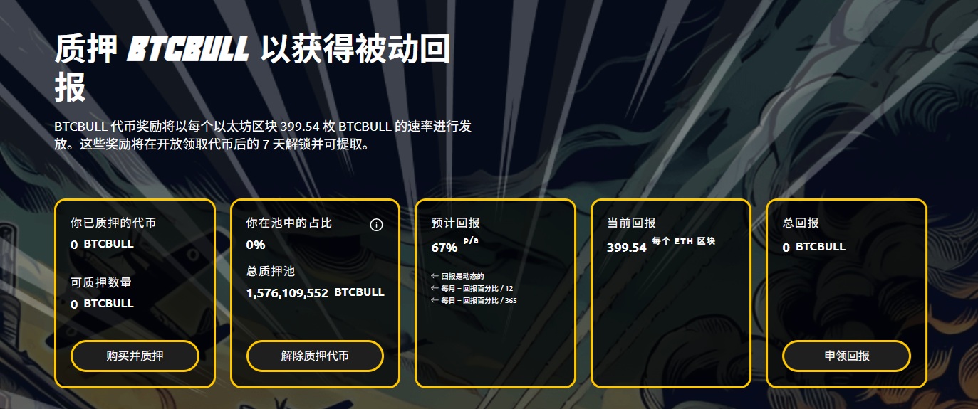 買入後還可以立刻通過平臺原生質押協議進行質押,目前年化收益率(APY)高達 67%。也就是說,在等待比特幣空投的同時,你的 $BTCBULL 也在為你持續產生收益。