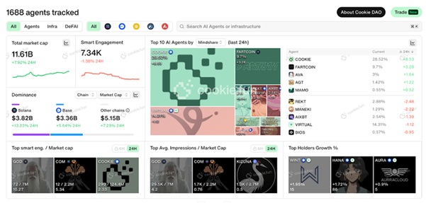 AI 應用仍在加速擴張,每週都有大量新應用上線。目前 Cookie DAO 已追蹤多達 1,688 個 AI 代理專案,總市值達到 116.1 億美元。