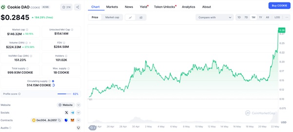 雖然主流大型山寨幣近期尚未完全跟隨比特幣的漲勢,但AI代理幣賽道卻已悄然走出獨立行情。基於Binance Smart Chain的Cookie DAO($COOKIE)作為AI代理指數專案,過去24小時內再度上漲30%,現報 $0.2845。