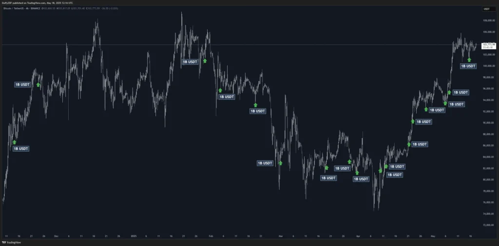 在 2025/05/15,泰達在 Tron 鏈鑄造了價值 1B 的 USDT,隨後該資金轉移到 Kraken,Bitfinex和幣安交易時 。