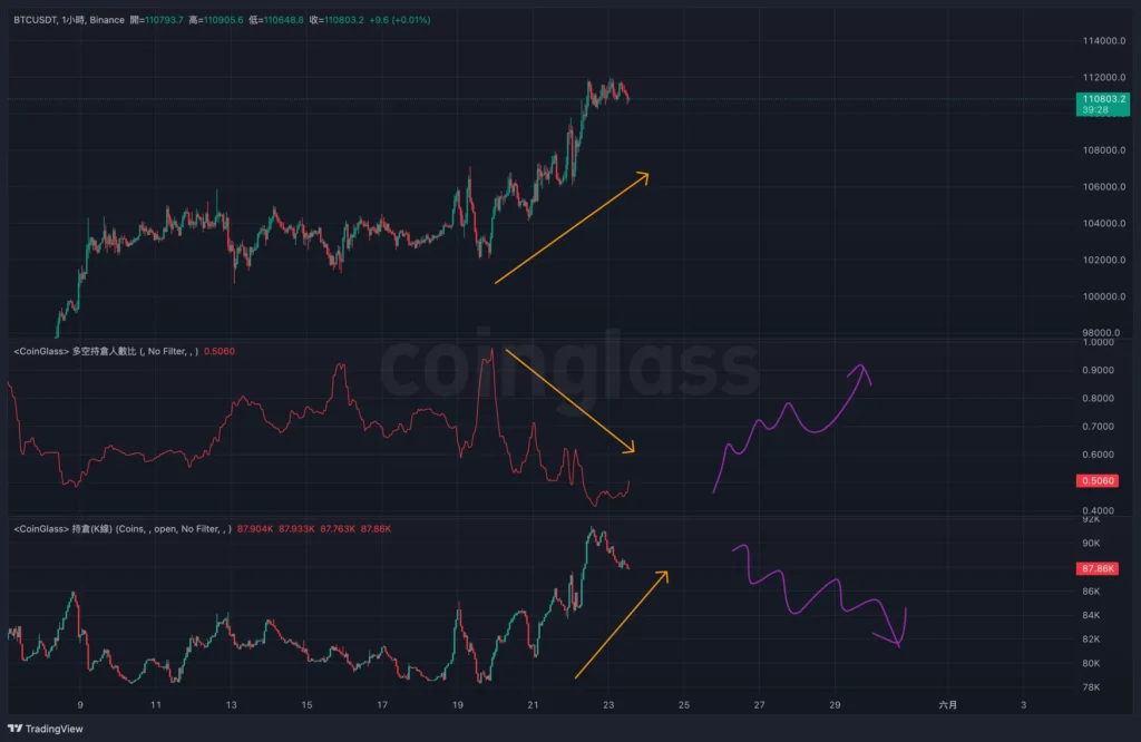 然而這樣的數據面向需要留意多空比、持倉量是否出現拐頭的跡象(紫色箭頭),當多空比上升、持倉量下降的資訊出現時,意味著先前進場多頭部位的巨鯨將手中的籌碼出場,而多單的出場 = 市價賣出,將會導致價格受阻。