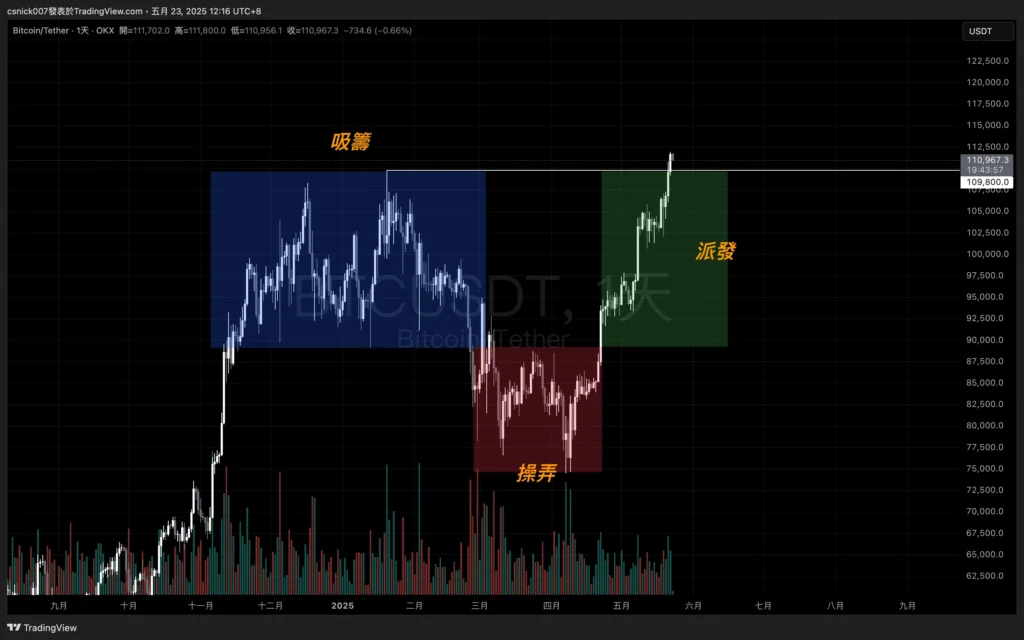 BTC 在日線級別中有著明顯的 PO3 走勢,PO3 的概念如上圖,將走勢分成三種區塊:吸籌、操弄以及派發,在面對 PO3 的走勢時我們能夠去佈局策略位置多半是落在操弄以及派發中。