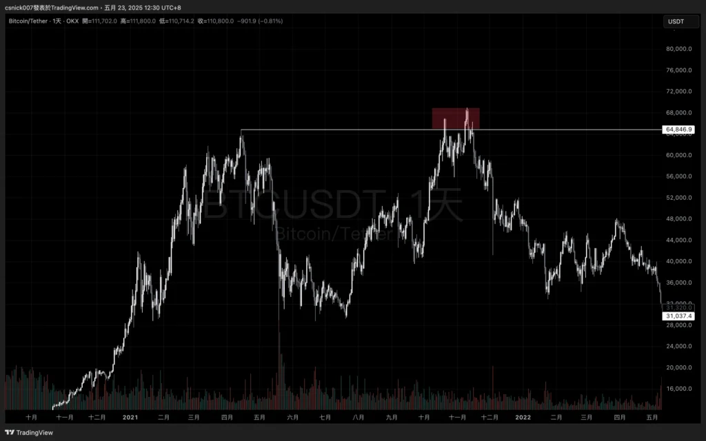 BTC 現階段進入價格真空區(ATH)此處需要關注的是大級別的假突破,以先前 2021 年初~年末的表現做舉例,BTC 當時再次創下歷史高點 69,000 後再次出現回落,日線級別K 線收低於 2021/04/14 高點並形成大級別假突破樣貌,後續也迎來了長達一年的熊市。