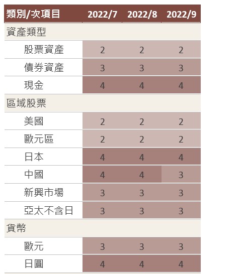 估值分數顯示,在上漲之後,股票再次看起來很昂貴,而債券則便宜到合理估值。對於全球股票而言,自 6 月中旬以來,今年的本益比已飆升 15%,降低了它們的吸引力。另一個負面因素是企業獲利,我們認為其成長正在失去動力;我們預測 2022 年獲利成長低於市場預期的 2%,如果經濟成長進一步走弱,則存在下行風險。我們的估值模型有利於新興市場、原物料、通信服務、英國債券、日元和歐元,並發現特別昂貴部分,如商品、美國股票、公用事業、歐元區指數連結債券、中國債券和美元。