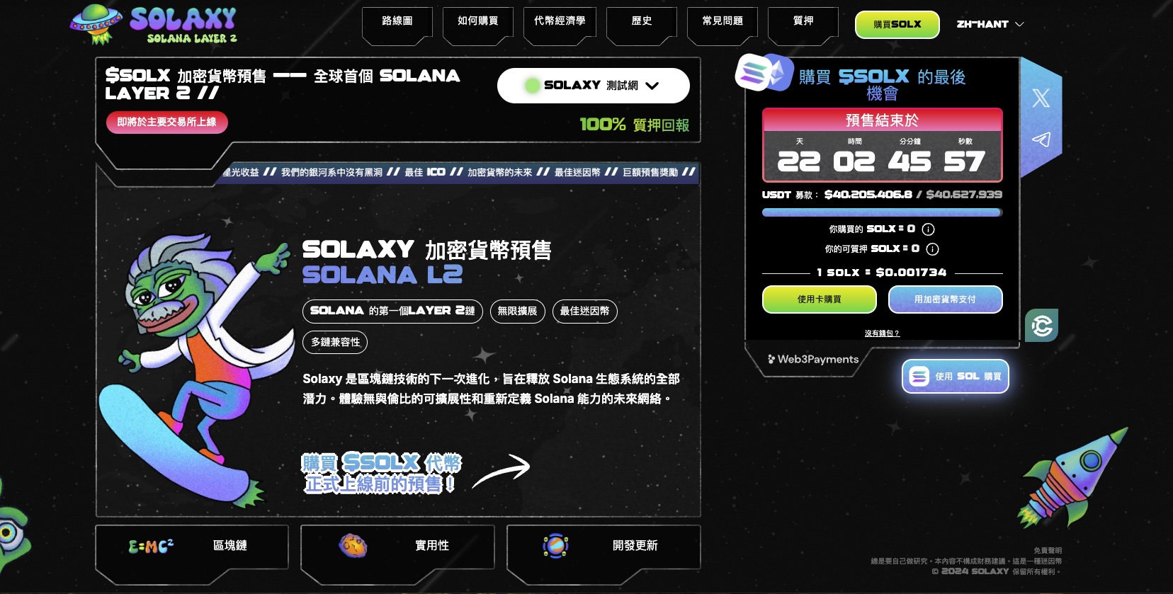 Solaxy 預售現正進行中,代幣銷售迅速。迄今已籌集超過4,000萬美元,$SOLX 目前每枚代幣價格為 0.001734。預售價格隨每個階段上升,早期買家鎖定最佳價格。 Solaxy已進入最後階段,預售將於21天後結束。