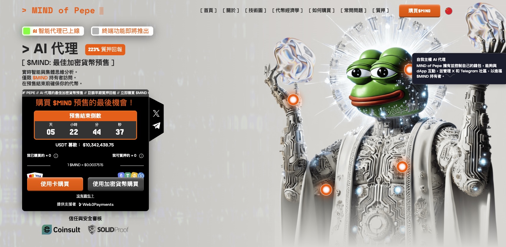 MIND of Pepe ($MIND) 是首個此類 AI 迷因幣。它同時呼應當前加密貨幣氛圍並擁抱未來,該代幣結合了區塊鏈功能與 AI 驅動特性,與市場中推動者互動。最重要是,它將為持有者提供關鍵交易見解。透過這種方式,它超越了其他加密貨幣,成為首個自主運作代幣。