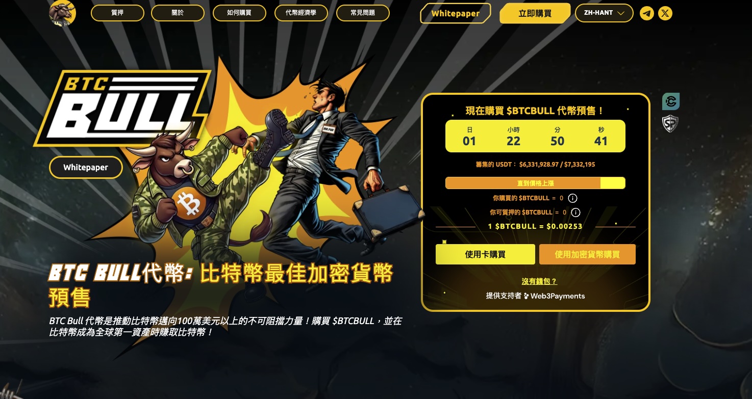Bitcoin BULL代幣 ($BTCBULL) 是本月最令人興奮加密貨幣預售之一。它為投資者提供了一種獨特方式,隨著比特幣攀升至 100 萬美元,享受各種獎勵。與僅作為錢包中資產傳統 BTC 持有不同,Bitcoin Bull Token 結合了比特幣價格增長力量,並提供 BTC 空投、80% 動態質押獎勵,以及透過代幣銷毀實現通縮代幣模型。