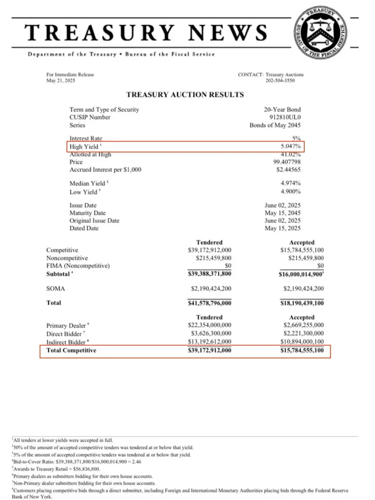 在穆迪將美國主權信用評級下調之後,緊接而來的5月21日20年期國債拍賣成為觀察投資人信心變化的關鍵窗口。然而,從各項拍賣結果來看,整體表現可評為中性偏弱,顯示市場對長期美債的態度趨於保守。
