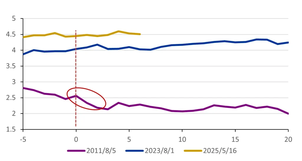 美國自二戰之後主導國際經濟秩序,其美債也長期被視為無風險資產,但如今美國失去最後一個AAA評級。直觀而言,下調評級就好比投資人對於美債失去信心或承擔的風險增加,理應導致買盤減少、殖利率往上(債券價格往下)。不過實際上,以過去美國在2011年受到 S&P 、2023年受到 Fitch 降評,反而讓殖利率向下走。