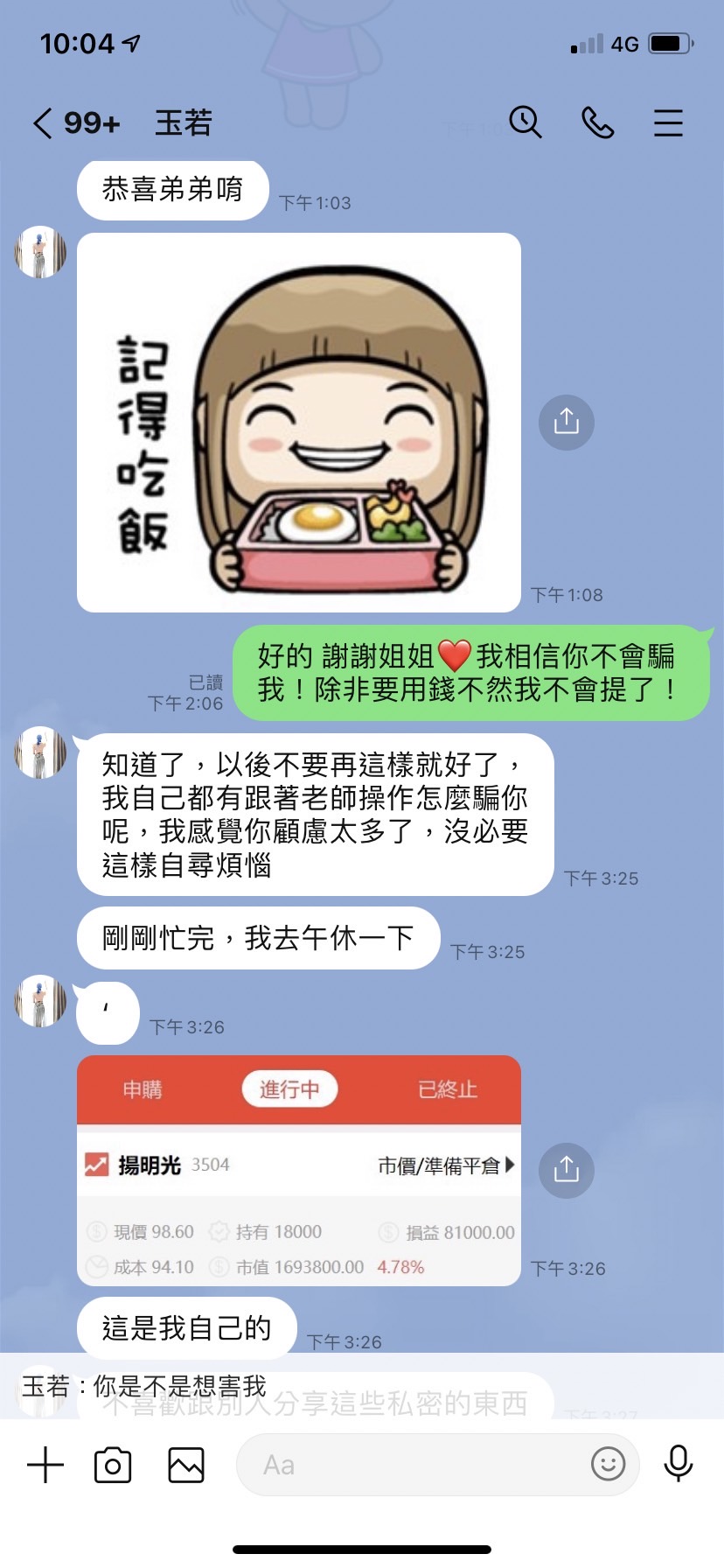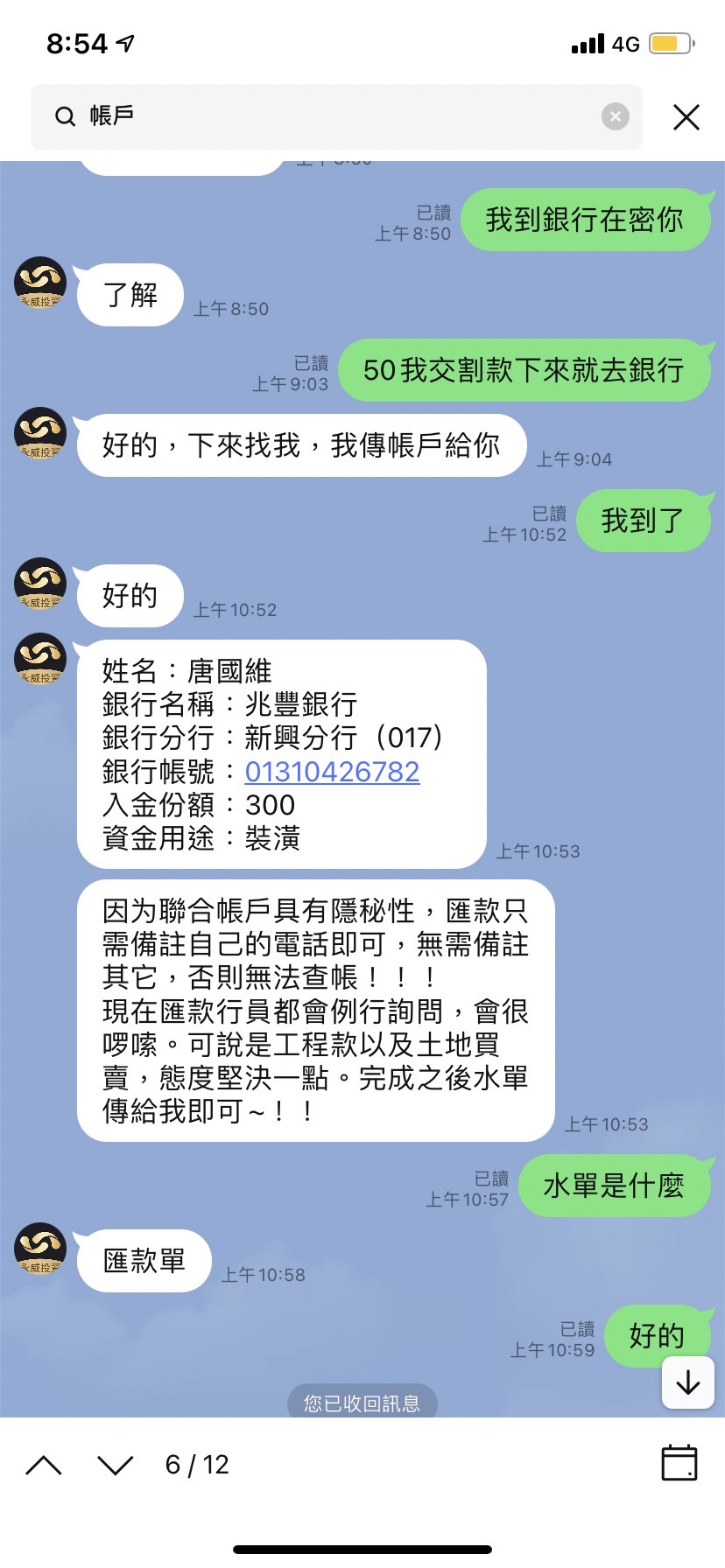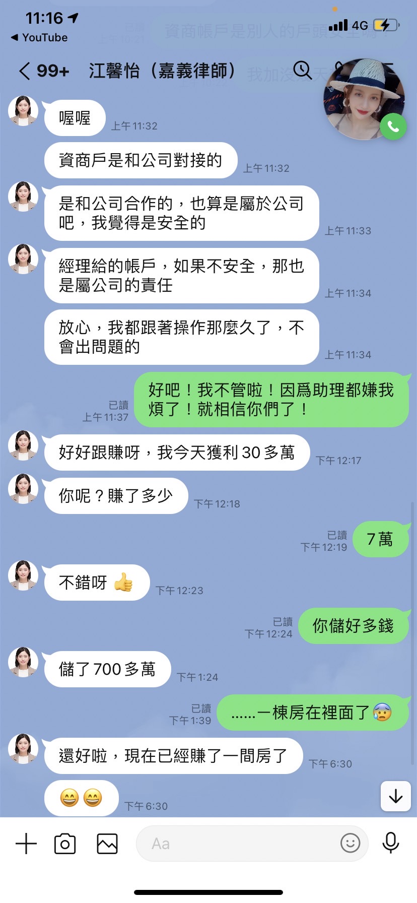 詐騙女透過簡訊與受害人取得聯絡,然後聊了一陣子取得受害人的信任之後,推薦永威app這個詐騙平台給受害人,教受害人怎麼用,怎麼投資,還有群組裡暗樁假冒律師加入受害人,然後用律師身份告訴受害人自己也投資700萬讓受害人降下心防,投入資金,最後出金受阻,無法出金。