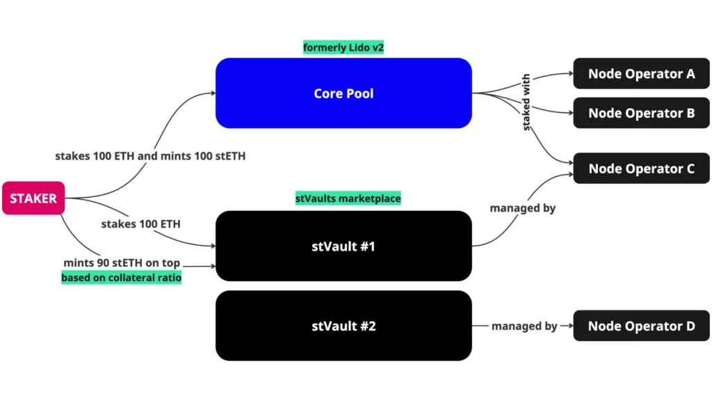 Lido V3 推出的 stVault 主要會帶來兩個影響,第一個就是為未來以太幣 ETF 的質押做準備。根據原來 V2 中 Core Pool 的設計,該質押池是由 Lido 集中管理,然後會將 ETH 非配給不同的驗證者做質押。