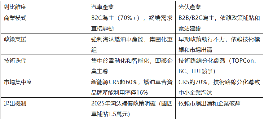 儘管中國汽車產業與太陽能產業都面臨產能過剩風險,但兩者在商業模式、政策支援和技術發展路徑上存在顯著差異,這些差異將決定汽車產業是否會重蹈太陽能產業覆轍。