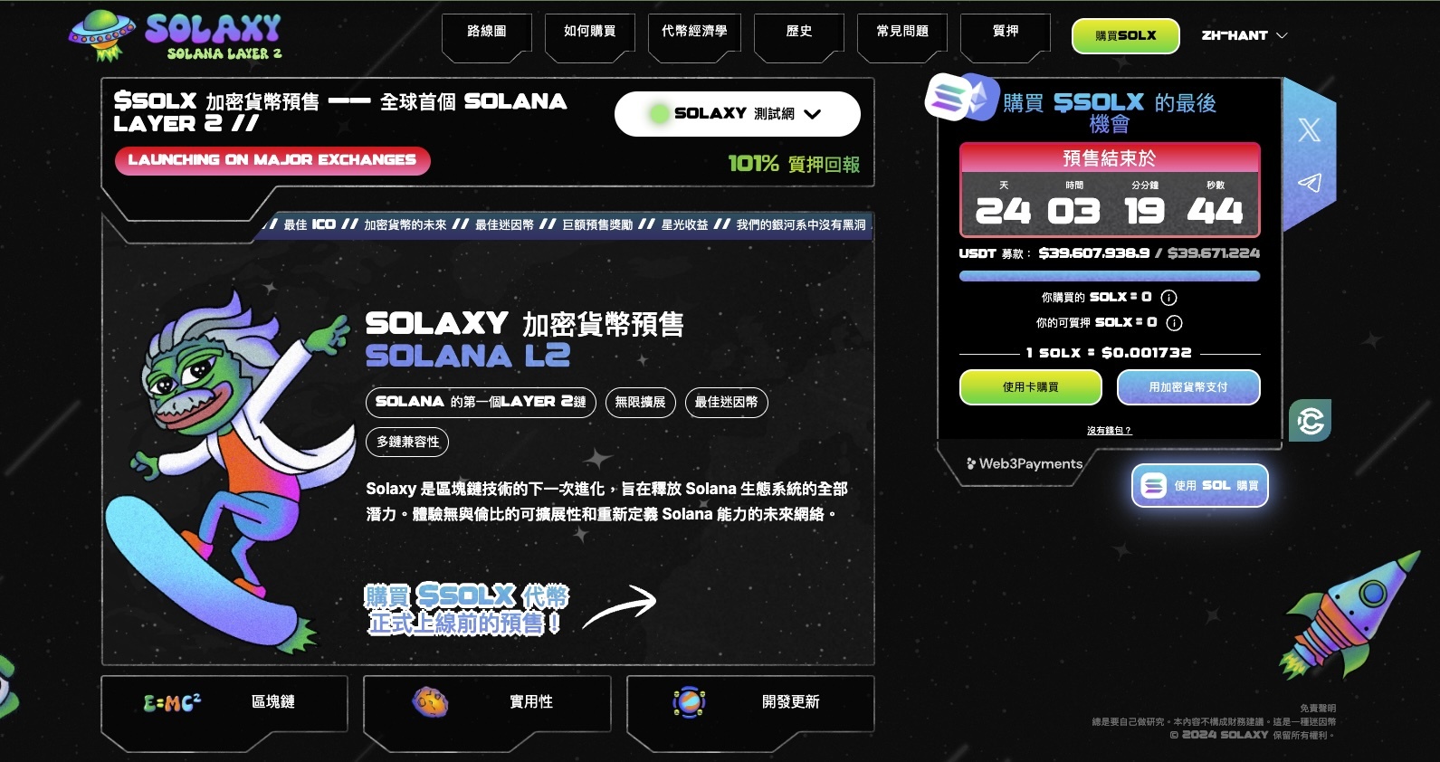 它的終極目標是TPS達到10,000,比Solana的原生效能還高一大截。對於整個Solana生態來說,這不只是補足缺陷,更是下一波meme幣擴張的基石。畢竟誰都不想交易卡半天或花大筆gas fee對吧?Solaxy已進入最後階段,距離預售結束只餘下19天。