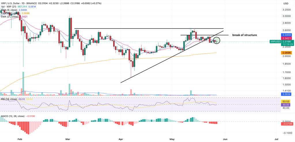 從日線圖來看,XRP 已經跌破先前的多頭結構,並且從下方回測了過去的支撐區,這通常被視為短期的看跌訊號。