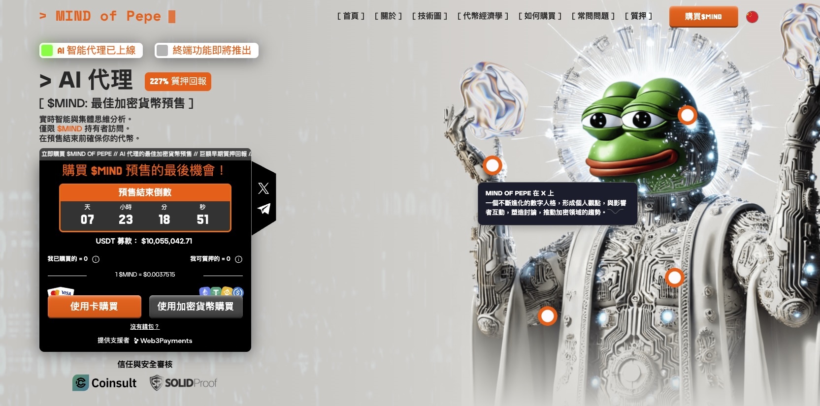 目前官方宣佈預售已累計籌得超過數百萬美元,且將在完售後展開空投、質押與AI訓練模組公測等階段。如果說 BTC 是全球對抗法幣貶值的解方,那麽 MIND of Pepe 則可能是下一個引領迷因幣升級的智慧化代表。
