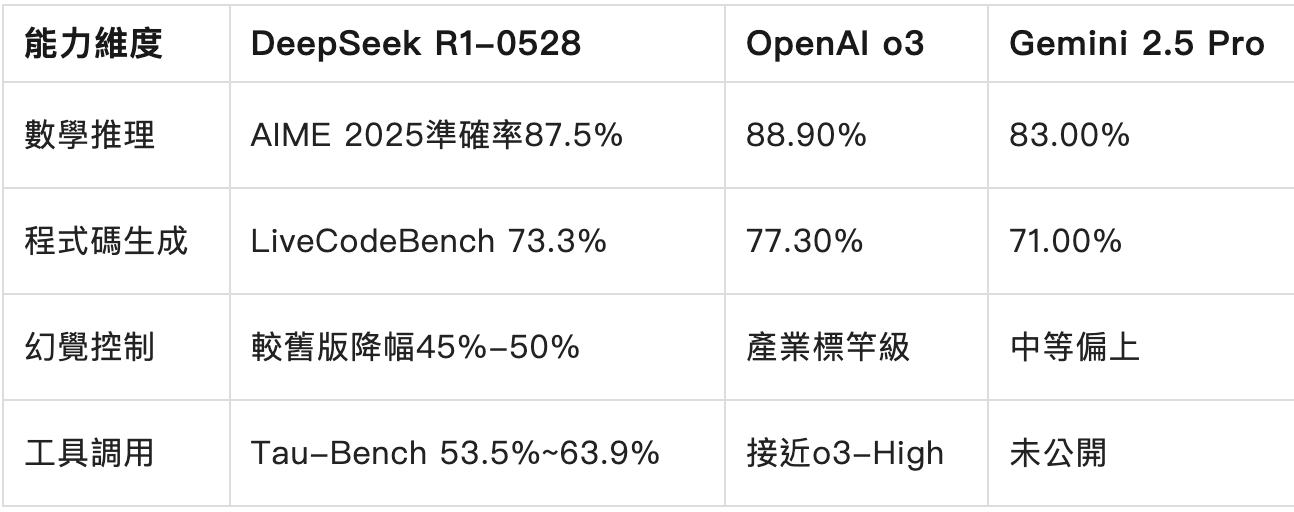 可見,R1在數學與程式碼領域已逼近o3,幻覺控制躍居國產模型首位,但工具呼叫能力仍落後頂尖閉源模型。