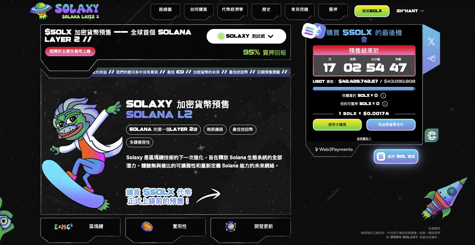 在這樣的情緒推動下,原本就備受關注的Solaxy($SOLX)開始獲得更多視線。這款Solana Layer2擴容專案主打高效與低費用,採用零知識彙總技術處理鏈下交易,並在主網上結算,讓它成為DeFi和Web3遊戲開發者的新寵。它在預售階段已吸引4,200萬美元資金,顯示出市場對於Layer2領域的殷切期待。Solaxy已進入最後階段,預售將於16天後結束。