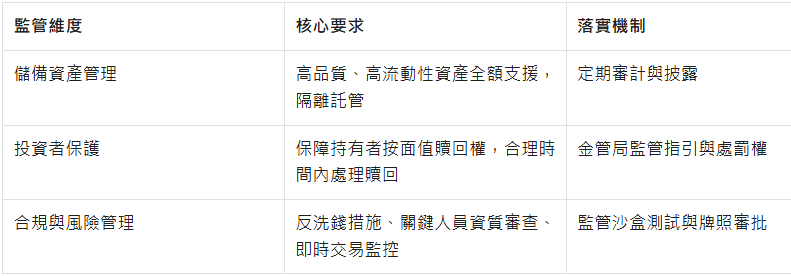 香港金融監管部門積極佈局。香港金管局於2024年3月推出港元穩定幣監管沙盒,吸引渣打香港、京東集團旗下京東幣鏈科技等多家機構參與測試。《穩定幣條例》明確建構了三大監管支柱:儲備資產須為高品質、高流動性資產,全額隔離託管;確保持有者按面值贖回權;發行人需遵守反洗錢、定期審計與關鍵人員資質審查香港財庫局副局長陳浩濂強調,監管目標是平衡“金融創新與風險管理”,使穩定幣成為可靠支付工具。