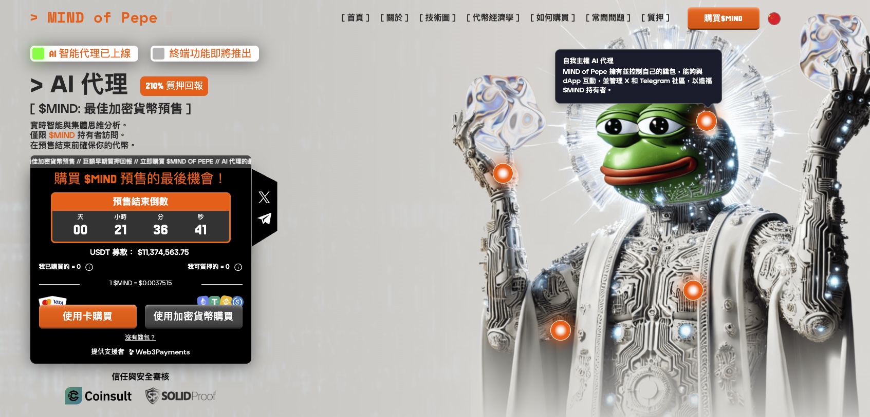截至目前,MIND 正在進行的預售已籌集近 1,150 萬美元,成功結合了 Pepe 品牌效應與本輪牛市中最強勢的迷因幣敘事之一:AI 代理人。