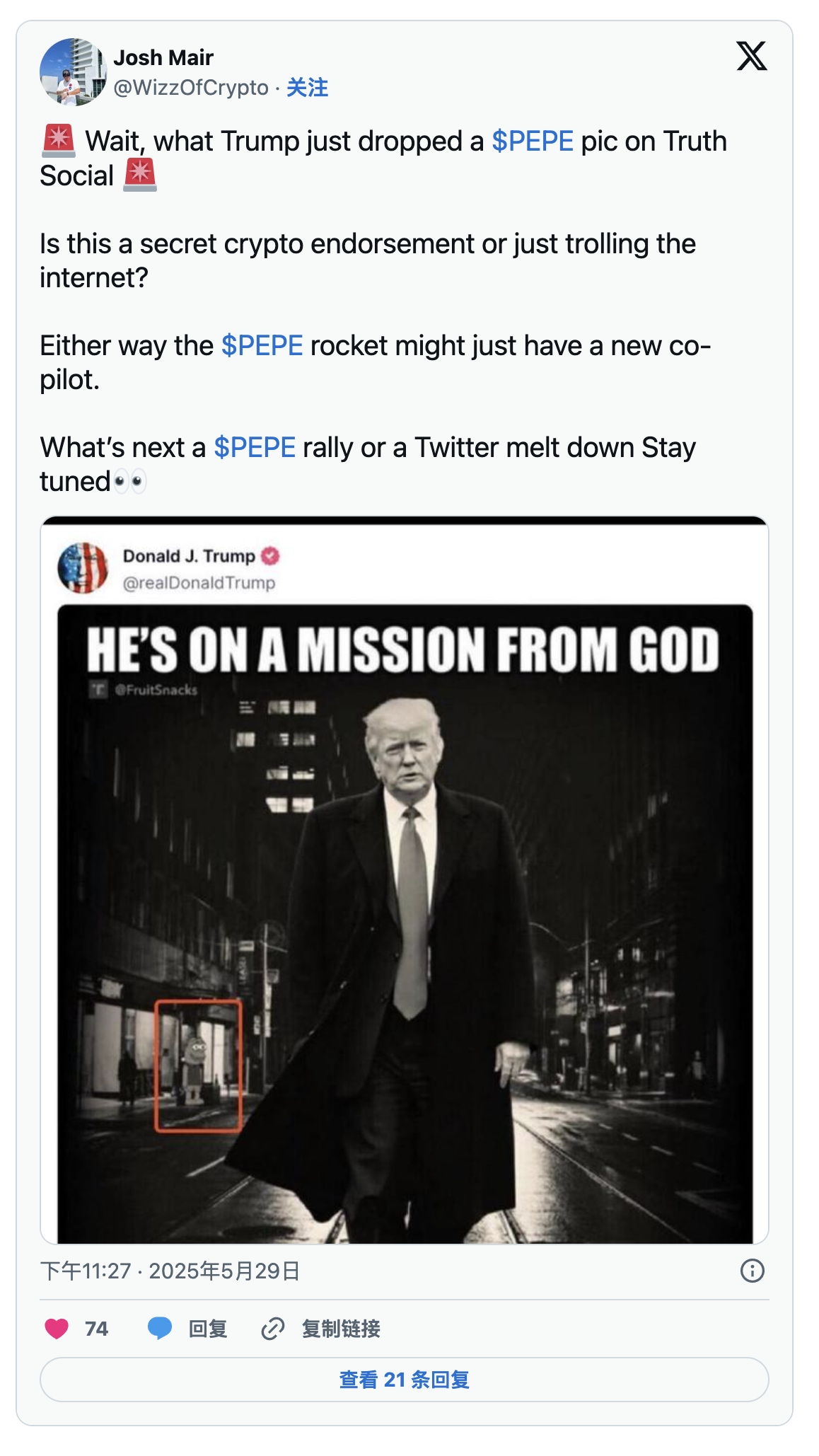 川普在 5 月 29 日於 Truth Social 發布的一則貼文,被廣泛解讀為對 Pepe 的隱晦致敬,引發網路熱議,並助長了看漲的 Pepe 價格預測。