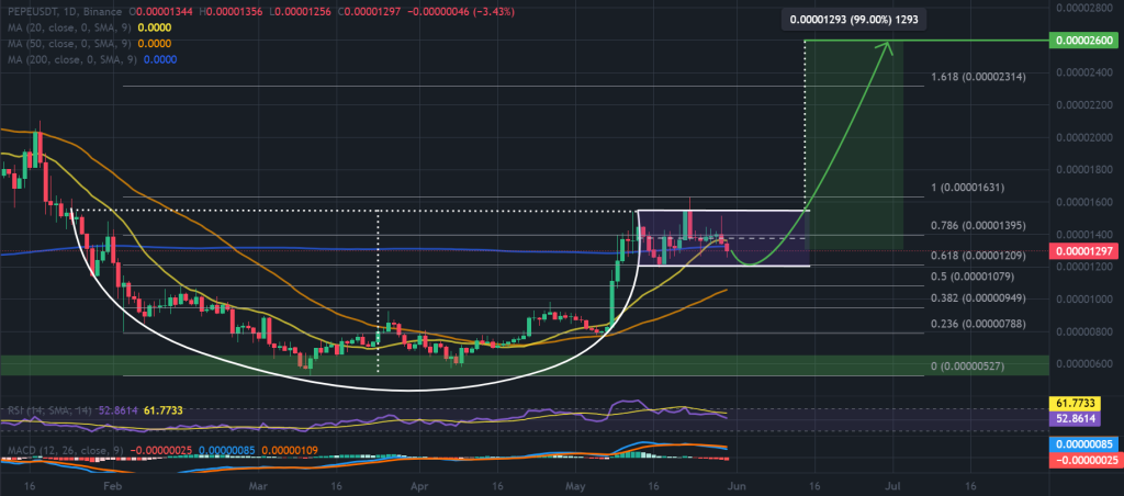 若有新的社群催化劑出現,該形態仍可能維持,而 0.618 費波那契回檔位($0.00001)作為小幅修正期間常見的底部區域,有望成為潛在的反轉點。