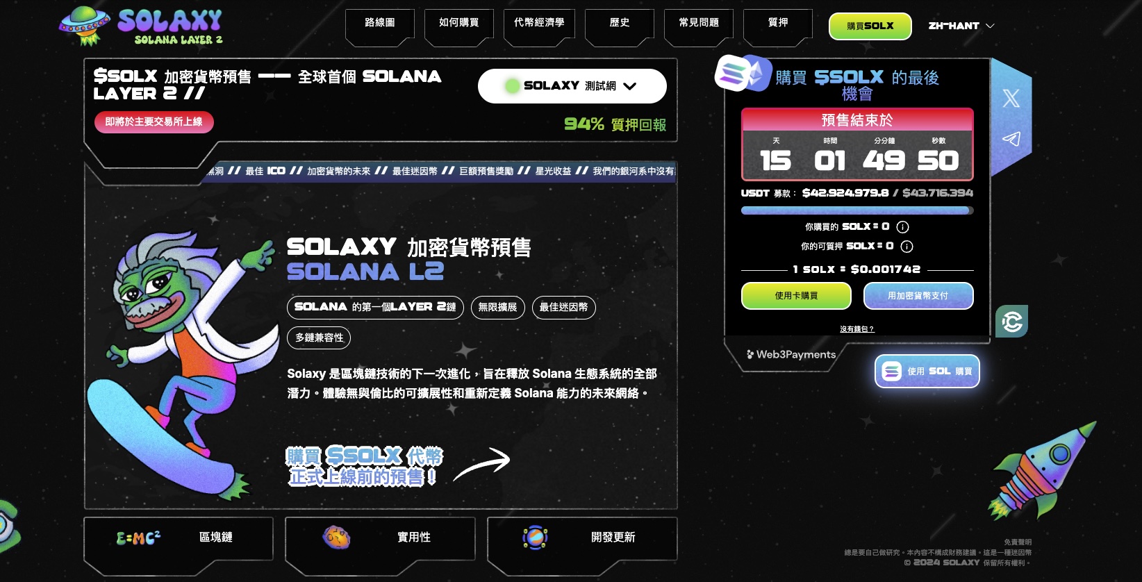 別看Solaxy現在還沒上市,它可是目前Solana生態裡最火熱的Layer 2專案。光是預售就已經吸走超過4,300萬美元資金,你就知道這幣被市場看得多重,Solaxy已進入最後階段,距離預售結束只餘下16天。Solaxy主打的,就是解決Solana在高峰時期交易擁堵、手續費飆高的問題。