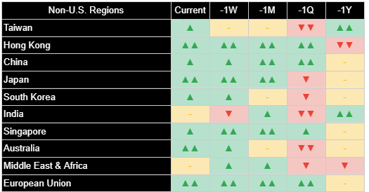 本輪行情的關鍵的啟示,在於短期市場情緒與長期趨勢之間的分歧。儘管地緣政治發展可能驅動每日表現,但主要地區持續的正向趨勢表明基本面的利多因素依然存在。拉丁美洲亦出現顯著改善,其趨勢已轉為非常正向,顯示國際市場的強勢正在擴大。