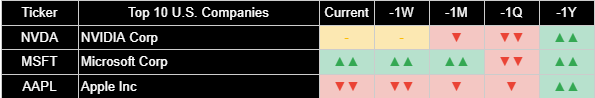 市場上市值最大的幾家企業表現分歧,反映了產業間資金輪動與內部結構的交錯影響。微軟(Microsoft Corp)(+1.32%)等科技龍頭上漲,而特斯拉(Tesla Inc)(-2.24%)則顯著落後。這些巨擘的潛在趨勢評估則呈現明顯分歧;微軟(Microsoft)和Meta (Meta Platforms Inc)持續展現非常強勁的正面動能,而蘋果(Apple Inc)則仍深陷負面趨勢。