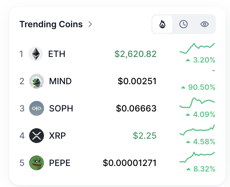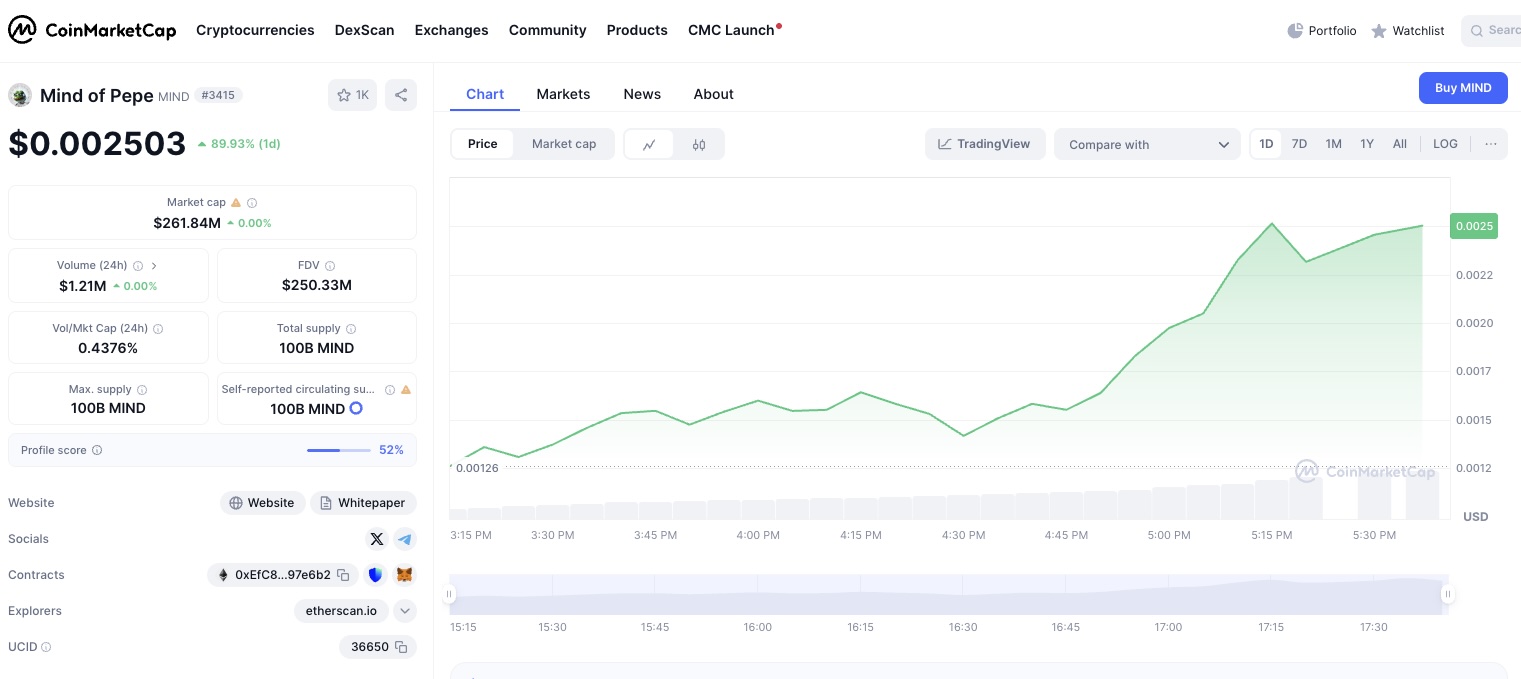 根據最新的 CoinMarketCap「Trending Coins」排行顯示,MIND of Pepe 名列第二位,僅次於 Ethereum(ETH),成功超越多枚主流幣種如 XRP、PEPE 及新興AI幣 SOPH。$MIND 當前報價為 $0.002663,對比其預售價 $0.0037515雖仍略低,但從上線初期最低點反彈超過90%,漲幅驚人。