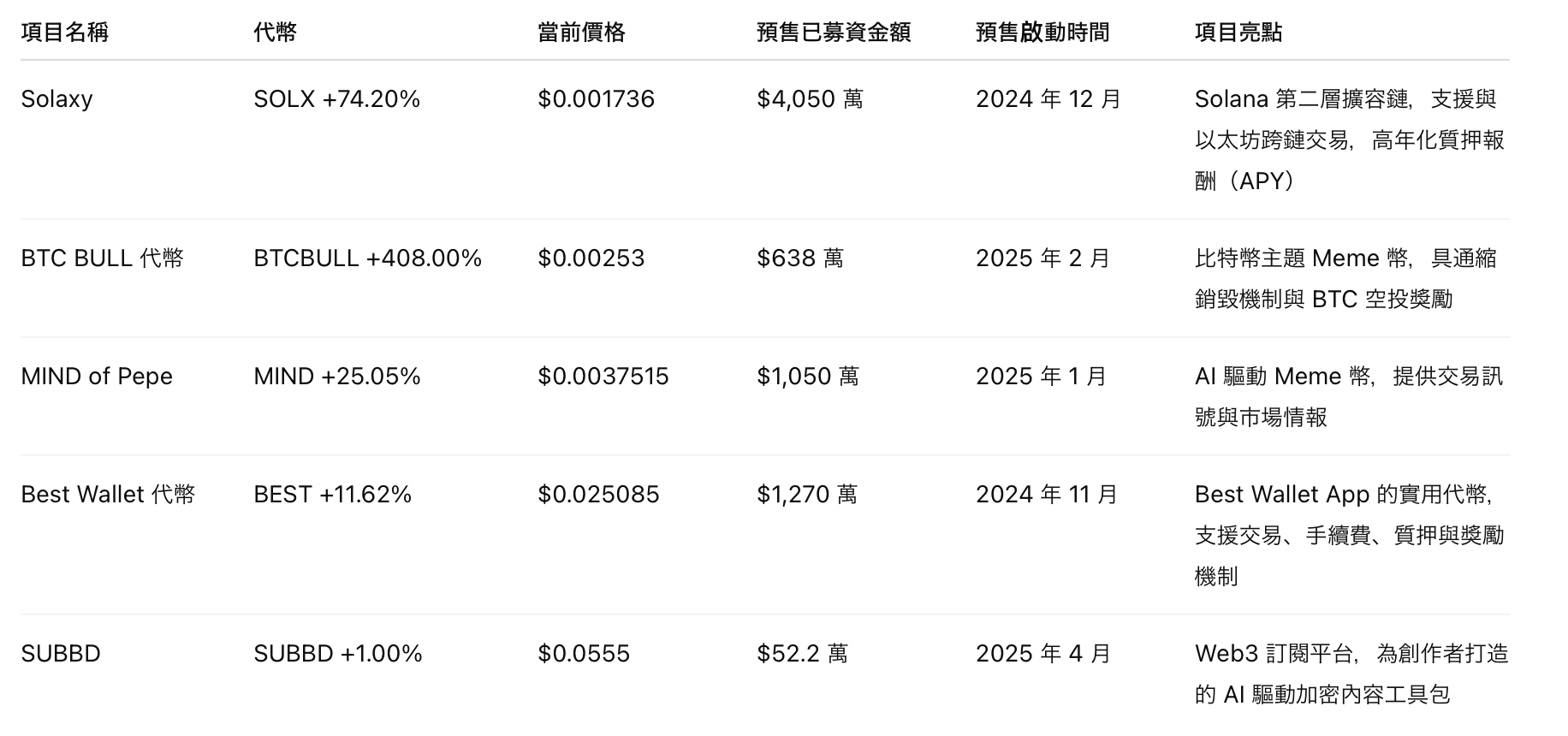 每個項目目前都處於預售階段,因此流動性和上線日期尚不確定。 Solaxy 因其聲稱採用 Solana 二層解決方案而顯得與眾不同,而其他項目大多是 meme 幣或平台代幣。