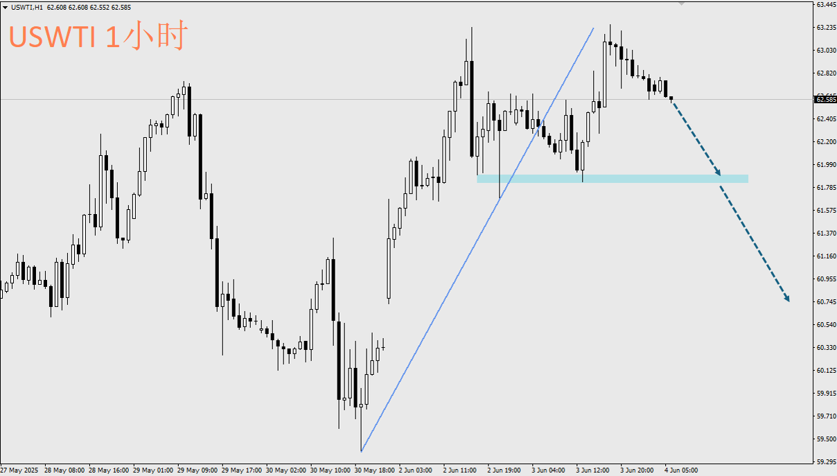 油價自OPEC+宣佈7月繼續增產41.1萬桶的言論後,利空出盡,主要原因在於原先預期增產的幅度更大,因此這是油價連兩天上漲的供需因素。而且俄烏之間儘管曾在週一於土耳其舉行第二論直接和平談判,然而僅持續1個多小時,達成了交換約6000名陣亡士兵遺體的雞肋協議,看不到實質進展,也間接造成油價反彈。不過油價即將反彈至63~64.5阻力區間,可關注小時框出現的做空機會。