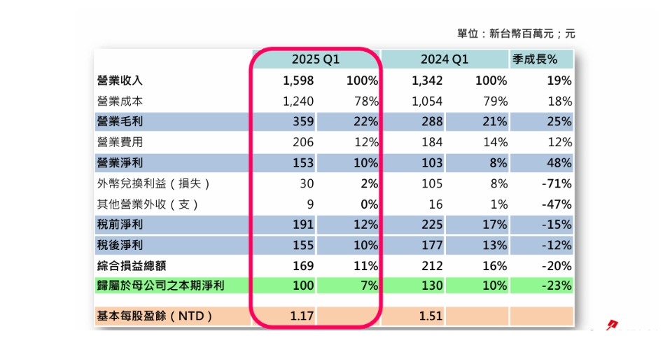 8.第1季營收15.98億元,年增19%,季減29%,毛利率22%,優於去年同期21%及第4季的22%,稅後純益1億元,年減23%,每股稅後純益1.17元,低於去年同期1.51及去年第4季的2.31元,主因為去年第1季有業外收益墊高基期。