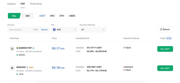 OKX的P2P面板支援四種加密貨幣:比特幣、以太幣、USDT 和 USDC。 OKX不收取任何額外費用,買家只需支付賣家的要價。另一項功能是OKX的快速交易,它簡化了P2P購買流程,OKX可以根據買方的要求獲得最佳匯率。