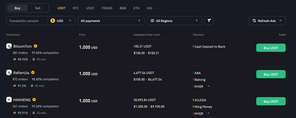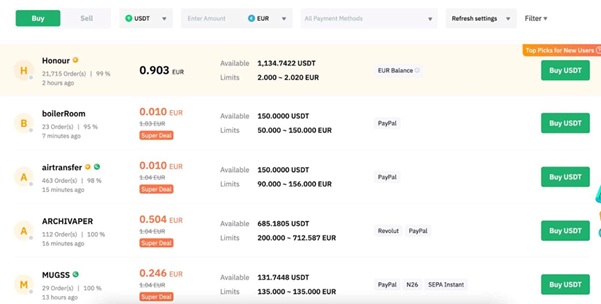 幣安是最適合客製化的P2P加密貨幣交易所之一。特別是如果您是有特定要求的買家。例如,初始搜尋需要首選貨幣、支付類型和國家。買家可以選擇比特幣、以太坊、BNB、Dai、USDC、FDUSD 和 USDT;每種貨幣都有充足的流動性。