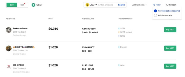 必應也是匿名P2P交易的絕佳選擇,被認為是最好的無KYC加密貨幣交易所之一。開戶過程只需要一個電子郵件地址和一個密碼。然後,用戶可以透過點擊 "無需驗證 "按鈕找到合適的P2P賣家。這可以確保買家只與不會要求提供驗證文件的賣家進行交易。