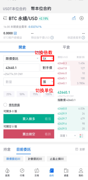 倍數:在開倉前或者有持倉無任何掛單的情況下,可以切換倍數。
