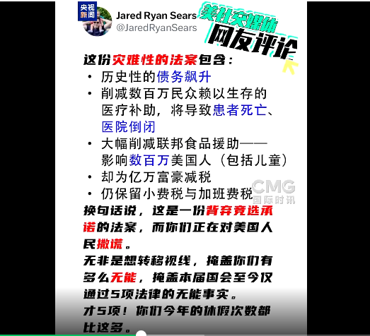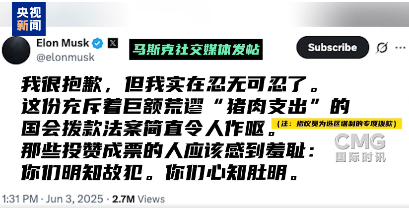 在5月27日,馬斯克離開“政府效率部”的前幾日,美國哥倫比亞廣播公司播出的一檔節目中,馬斯克第一次發表了其對稅改法案的評論。在當時,馬斯克的評價還僅僅是“感到失望”。
