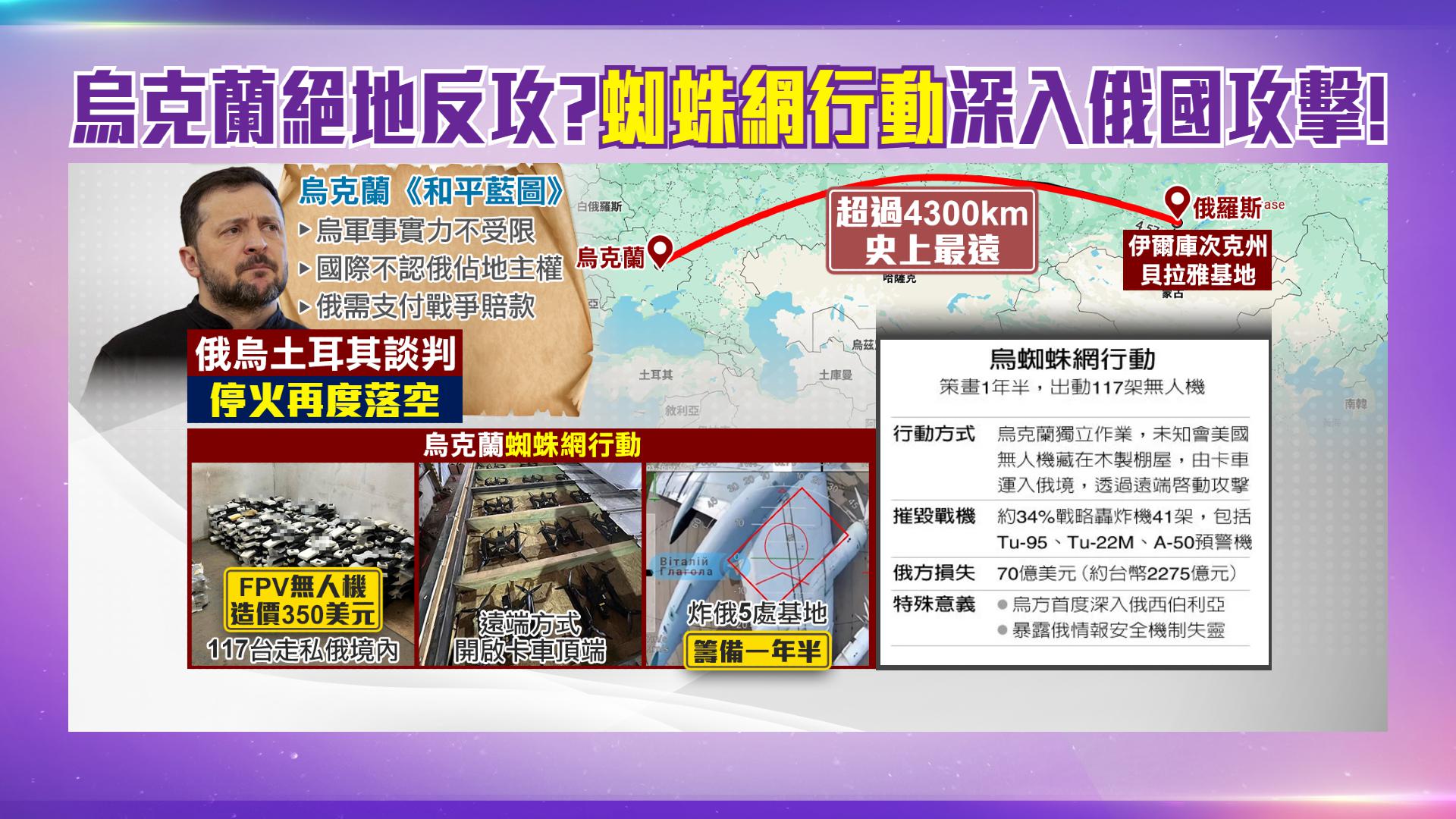 在俄烏會談召開前,烏克蘭深入西伯利亞的一處軍事基地發動無人機攻擊,擊中41架俄羅斯戰績,「烏克蘭打擊假消息中心」指出具體摧毀13架,俄方損失預計高達70億美元(約2100億元台幣),也損失34%可搭載戰略巡弋飛彈的武器;這也是烏軍首次在距離俄烏戰爭前線超過4300公里的遠方進行攻擊