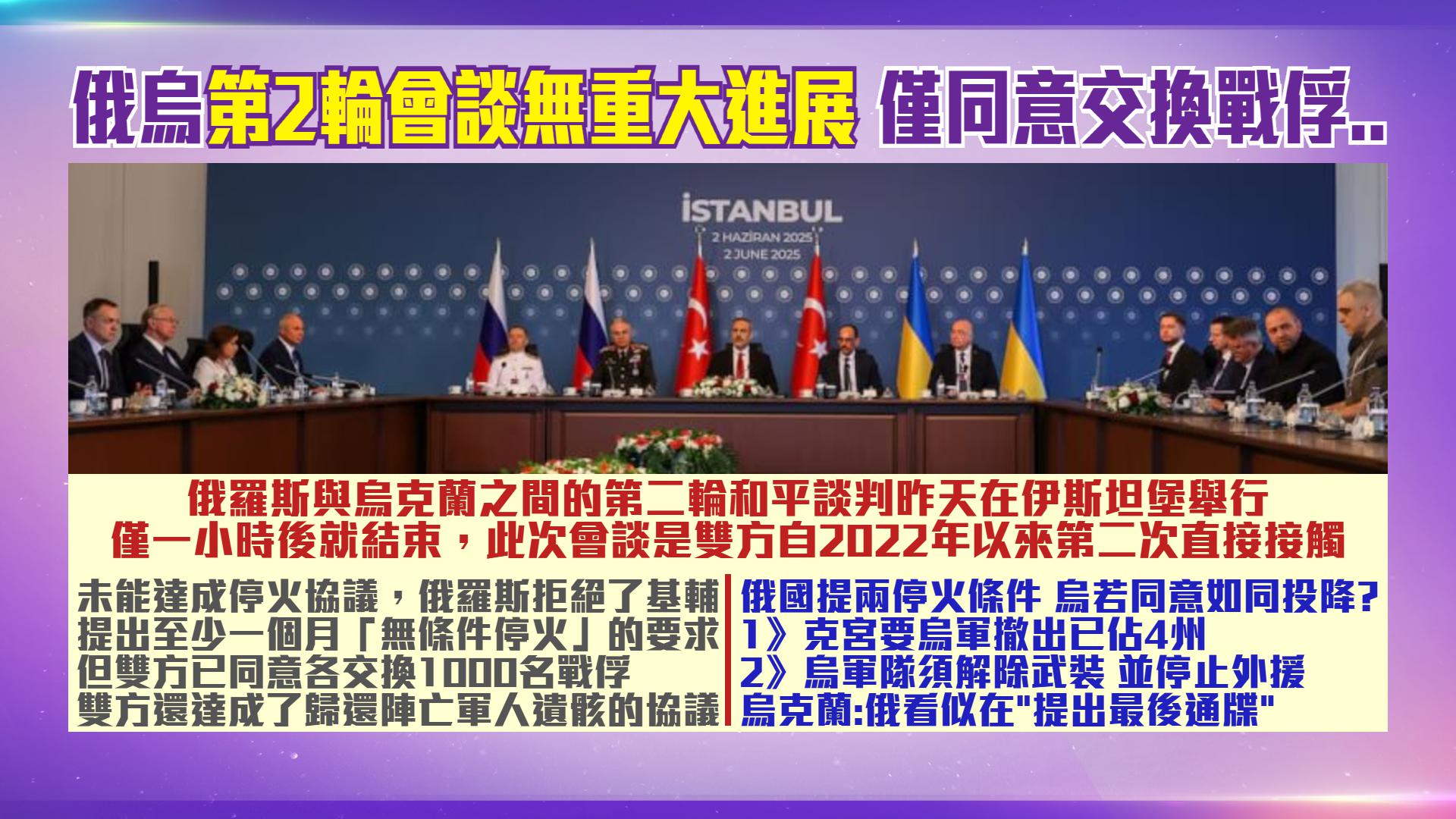 俄羅斯與烏克蘭之間的第二輪和平談判昨天在伊斯坦堡舉行,不出意外的,僅一小時後就結束,此次會談是雙方自2022年以來第二次直接接觸,已比原計劃晚了近兩個小時開始,並且沒有對延遲做出解釋