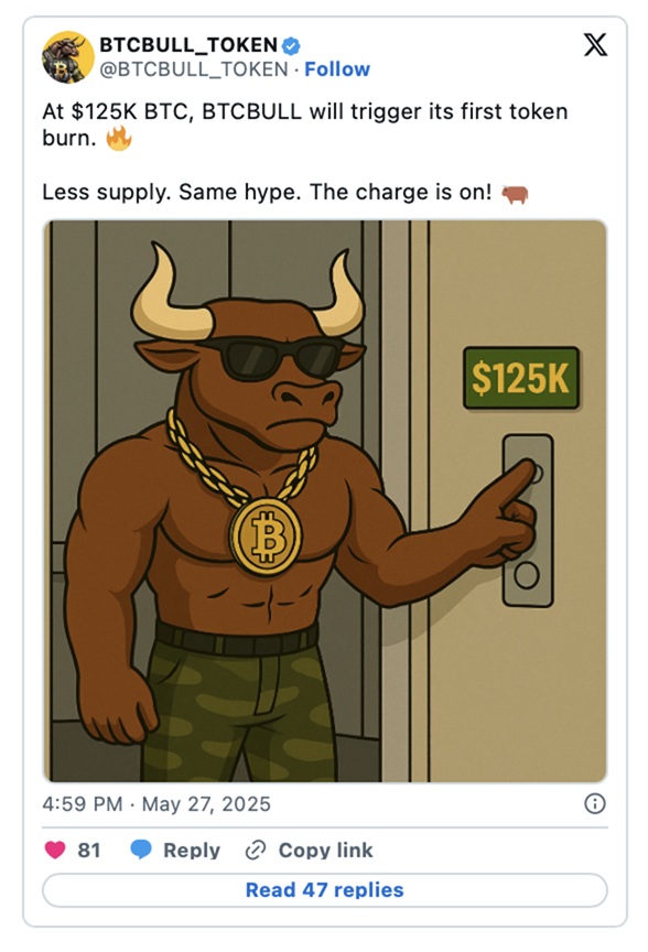 對於密切關注進度的投資者來說,還有另一項實用功能會在15萬美元之前解鎖:當比特幣觸及12.5萬美元時,$BTCBULL 將啟動一次代幣銷毀機制,永久移除部分流通量,提高稀缺性。這個設計仿效比特幣的減半週期,目的是增強代幣的長期價值潛力。