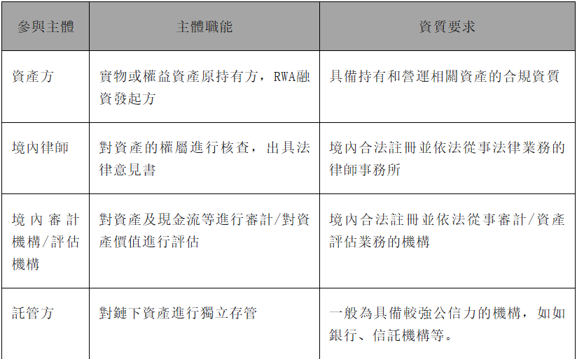 合規、規範的跨境RWA融資,需要眾多主體參與,這些主體必須具備合規資質。具體而言,參與主體及資質要求主要包括: