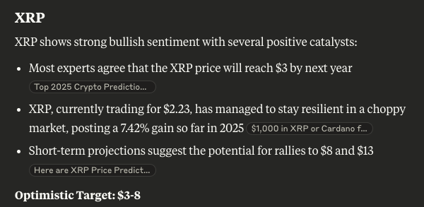 根據 Claude 的模型,瑞波幣 XRP 預計在 2025 年飆升至 $13,較目前約 $2.23 的價格飆升 483%。這項預測建立在以下因素之上:有利的法律裁決、機構採用的增加,以及日益轉變的監管環境。