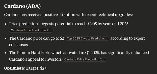 Claude 預測,ADA 預計在今年底前升至 $2.05,較目前約 $0.6636 的價格成長超過三倍。一些技術走勢圖也顯示,這波突破可能會更早到來。