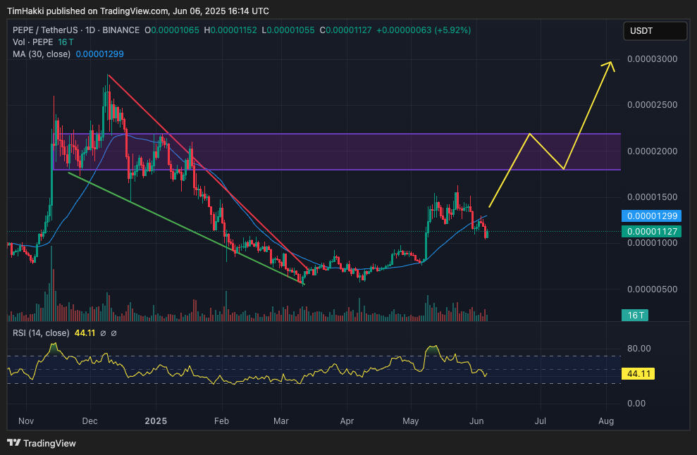 儘管目前價格較 2024 年 12 月創下的歷史高點 $0.00002803 美元仍低 約 59.5%,但技術圖形顯示,PEPE 自去年 11 月至今年 3 月間已構築出典型的下降楔形形態,這往往被視為潛在突破前兆。