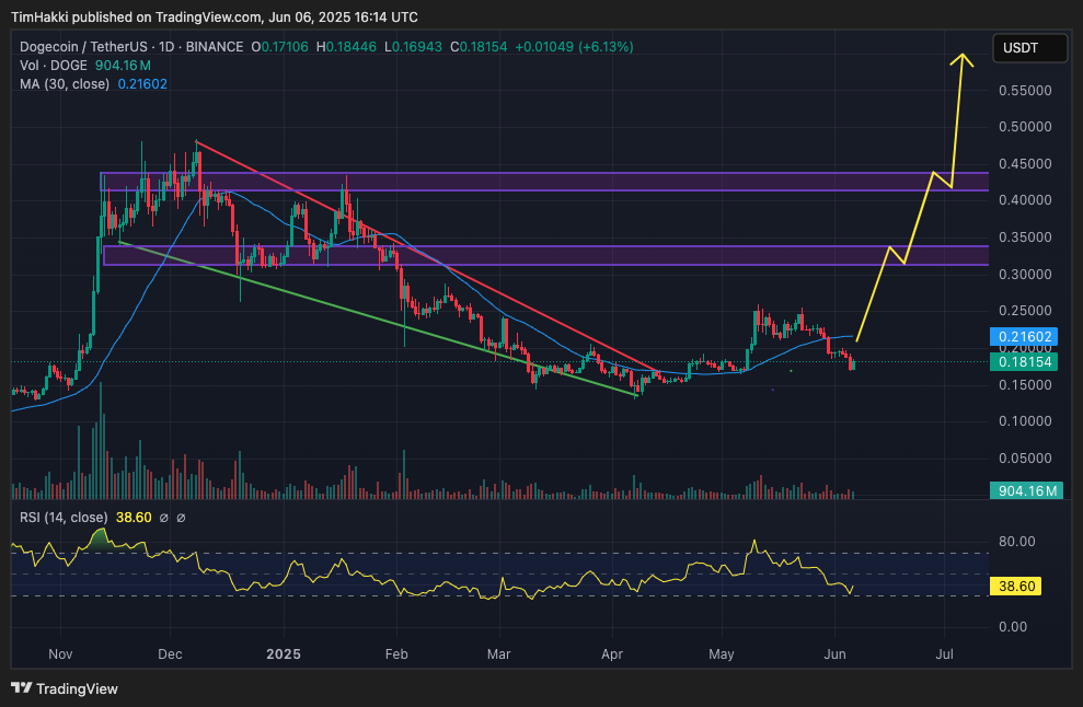 目前DOGE交易價格約0.1827美元,短期內受大盤拖累下跌4%,但技術圖形釋放出看漲訊號。分析師指出其已突破下降楔形形態,而這種形態往往是趨勢反轉的前兆。