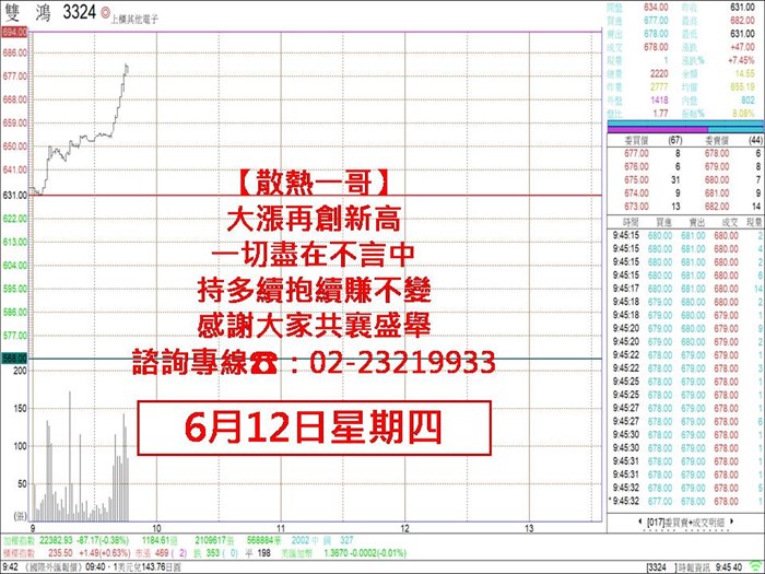 至於個股方面,全村的希望在『AI』,相關AI概念股仍是市場法人聚焦的主軸不變,繼機器人暨自動化設備和椿(6215)、資料中心概念股緯穎(6669)、記憶體南亞科(2408)、貨櫃萬海(2615)、半導體介面測試穎崴(6515)…等一檔接著一檔開心大賺後,今日散熱模組雙鴻(3324)持續大漲再創新高、AI之眼亞光(3019)及指紋辨識系統神盾(6462)接棒急拉大漲,真的是太棒了!一切都敢講在前面,感謝大家共襄盛舉!