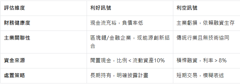 對於傳統行業企業,尤其現金流波動大或高負債公司,購幣風險遠大於收益。SolarBank的啟示在於:若必須入場,應尋找與主業的戰略結合點(如清潔能源抵消挖礦碳足跡),而非孤立投機。